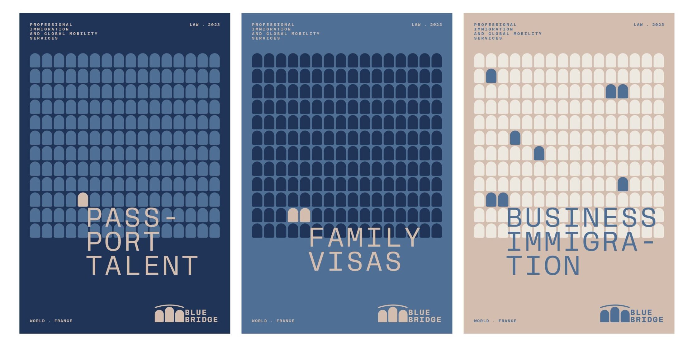 Acompañamos a BlueBridge en su proceso de re-branding desde el naming. Una boutique de abogados que opera en Europa y que busca ayudarle a las personas a vivir en libertad y con tranquilidad -en Francia principalmente y de manera legal-.